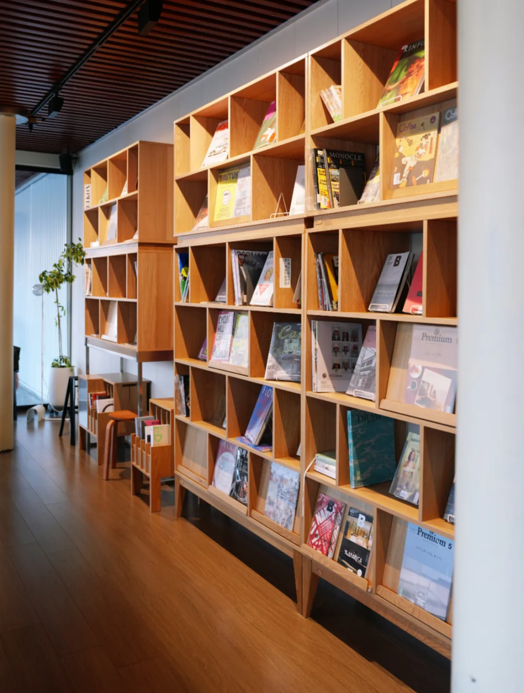 店如其名,春风习习一直被大家试做疗愈身心的文艺空间,暖色调简约设计,空间不大但功能齐全,甚至细节到有挂衣架。书架上有各种杂志书籍,即便一个人来,看看书、发发呆、看看窗外的亮马河,安静而舒适。