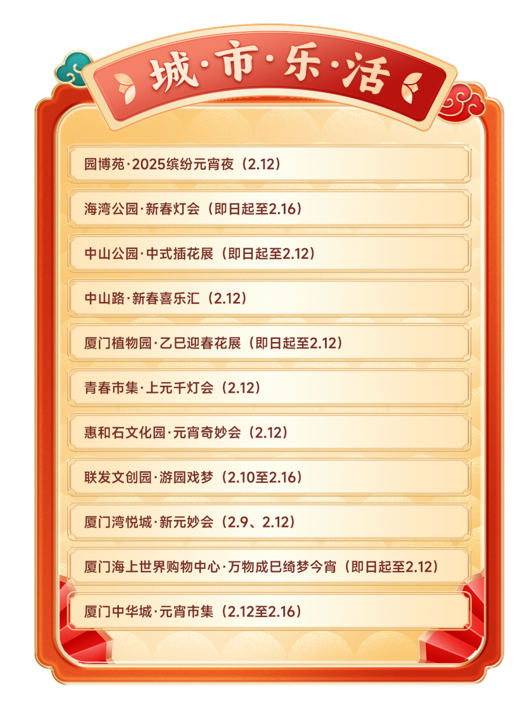 2月12日至16日期间,联发华美空间主会场有中国风流行音乐、越剧《梁祝》、古筝汇演。同一时段,联发文创口岸分会场在2月14日至15日有情人节、单身情歌专场音乐会。而上元灯会从2月10日至16日,在华美空间、东南天地、文创口岸、悦10空间设置不同打卡点,涵盖猜灯谜、祈愿树打卡等。活动期间更有风物吉市热闹开场,在华美空间有非遗国风市集,文创口岸情人节期间有创意摊位和后备箱市集。
