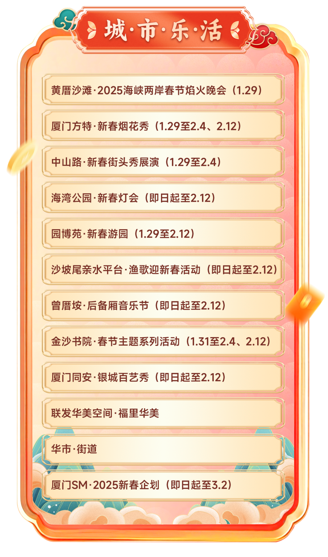 2025年春节,厦门园博苑以“花漾园博迎乙巳·闽滇年味过大年”为主题,准备了超多惊喜!极具闽滇特色的民俗演出、特色文创、美食市集以及花海美陈互动打卡等活动,定能让你感受到浓郁的节日氛围。