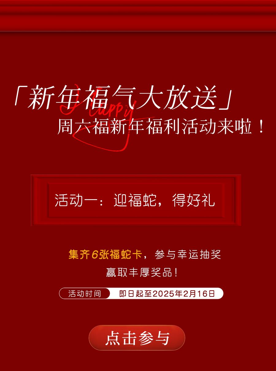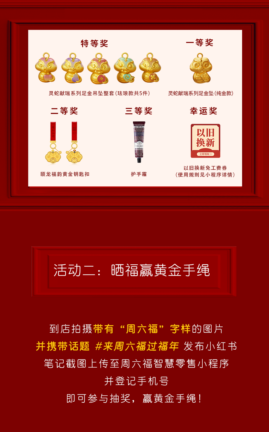 摘要:换新饰,抽黄金,迎接新春!周六福珠宝为您带来满满福气与好运