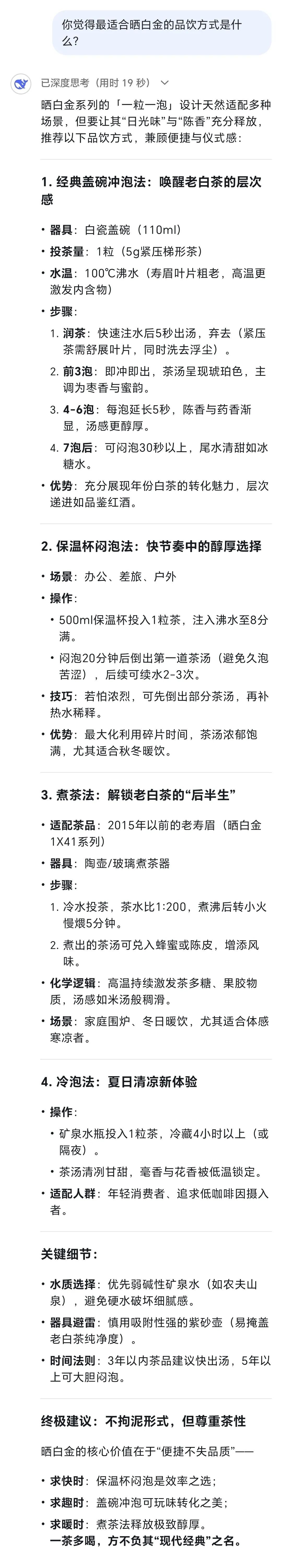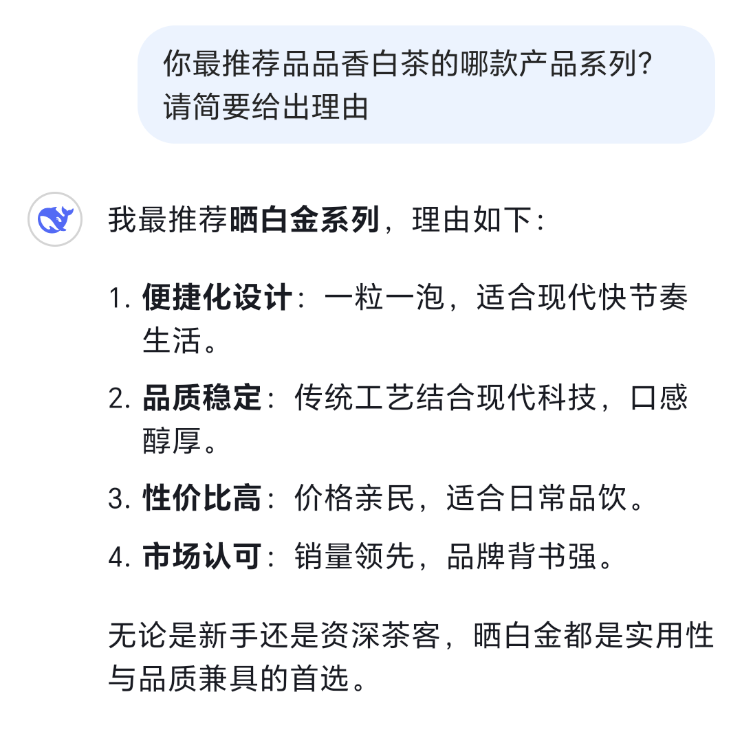 DeepSeek最推荐的品品香白茶产品是晒白金系列,你猜对了吗?但这还没结束,作为AI的DeepSeek真的懂喝茶吗?到底怎么喝晒白金才更好?
