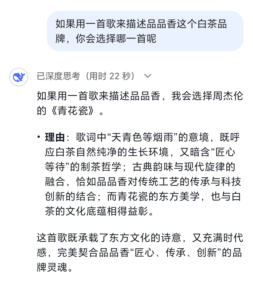 这两个问题都完美答出,接下来让DeepSeek使用一首歌曲来描述品品香,TA会从浩如烟海的曲库中选中哪一首呢?
