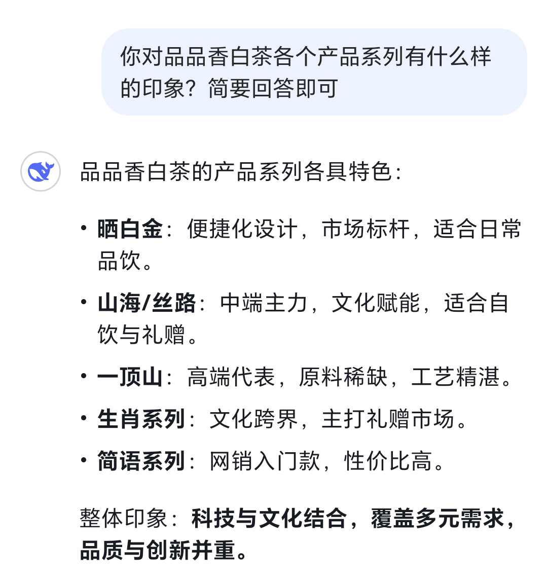 如果问DeepSeek对品品香各个产品系列具有怎样的印象,TA又会作何回答?