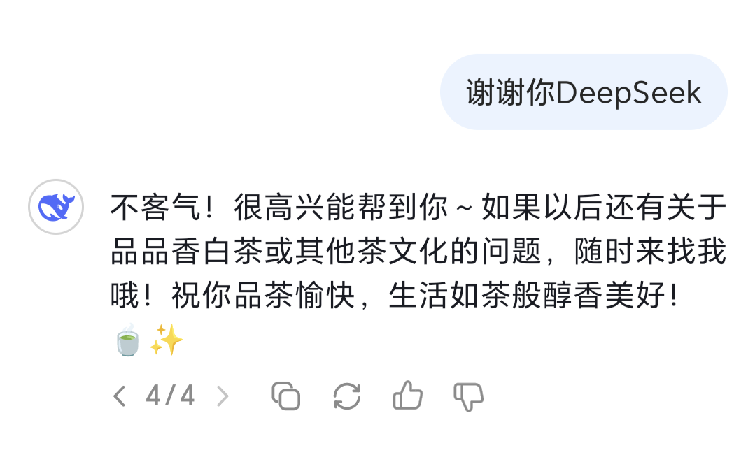 没想到这道题也没有难倒DeepSeek,按照场景、人群对不同品饮方式进行了分类,还附上了冲泡的详细操作步骤,还愣着干嘛?快快将DeepSeek这份喝茶干货攻略抱走收藏吧~