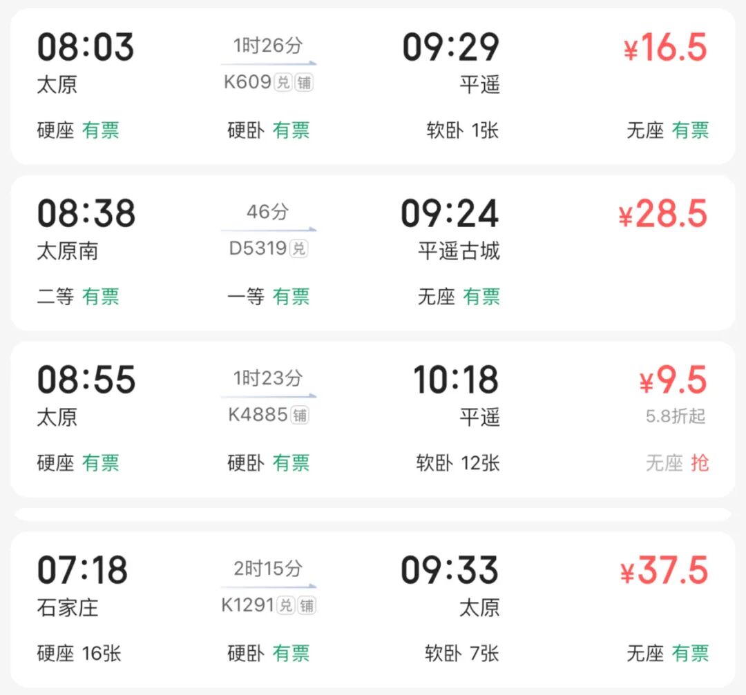 太原-平遥:动车只需半小时,车次较多。太原周边城市如:石家庄到太原只需2.5小时快速列车。戳链接订票子👇