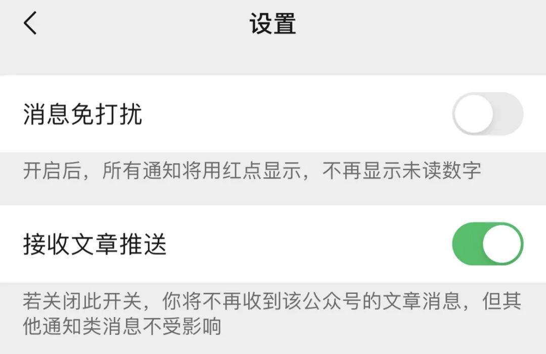 3、关闭“消息免打扰”,打开“接收文章推送”