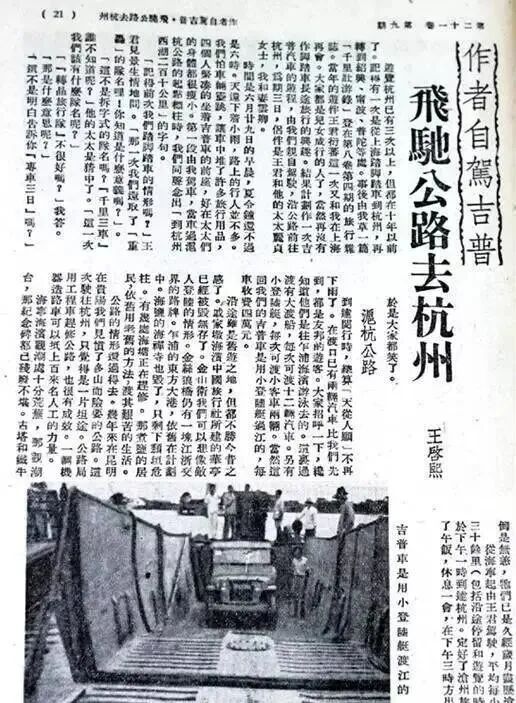 民国36年(1947年)9月发行的刊例中有一篇名《自驾吉普——飞驰公路去杭州》的游记,里面详细记录了上海的王启熙先生一行四人到杭州三日自驾游的详尽过程。