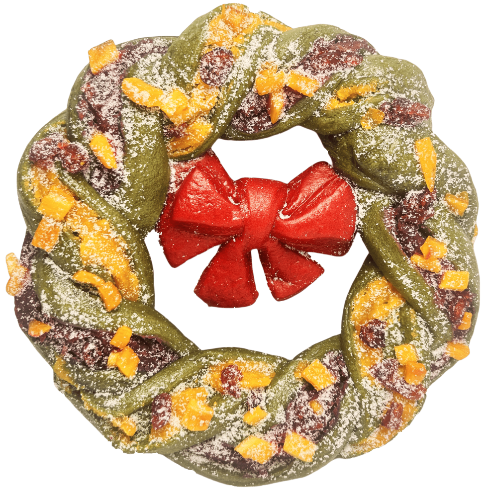 揉入紫薯馅、南瓜馅,撒上芒果丁和蔓越莓