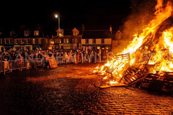 Clavie是一个浸满焦油、装满木条的木桶,在每年1月11日这天,当地人会扛着燃烧的焦油桶走上街头,成百上千的居民将在沿途跟随,任凭火焰在夜色中跳跃,直到登上小镇的历史地标——位于古堡遗址上的门丘(Doorie Hill)。在这里,Clavie被牢牢安放在山坡上,持续熊熊燃烧,直至最终散落为炽热余烬。若你来到此处,记得前去拾取一片燃烧后的木屑,据说拥有一块Clavie的碎片能为新的一年带来好运。