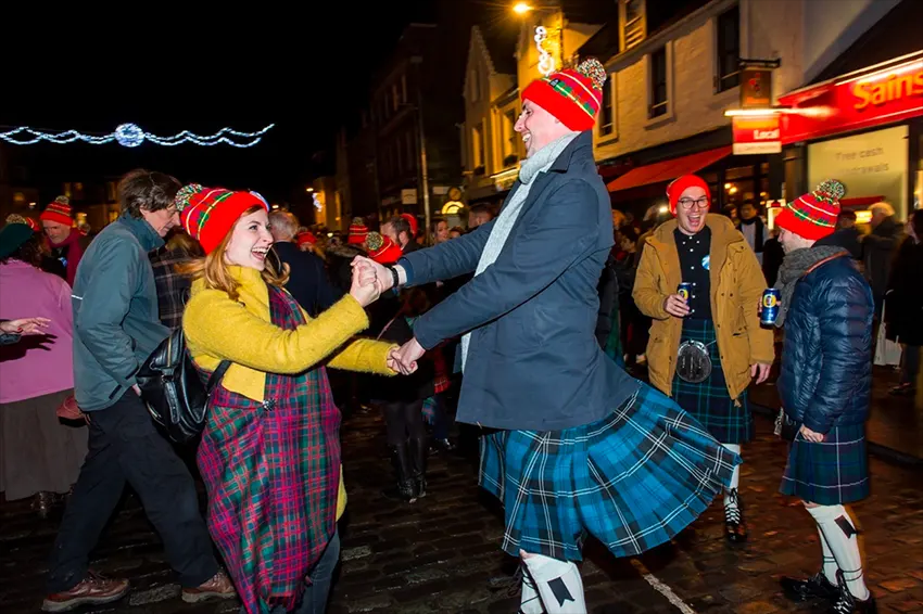 在这一天,苏格兰的大街小巷都会挂上苏格兰圣安德鲁十字旗(The Saltire),人们换上苏格兰裙(kilt),欢聚一堂,在风笛的悠扬声中跳起传统凯莉舞(Ceilidh),品尝库伦炖汤(Cullen Skink)、哈吉斯(Haggis)、克洛蒂布丁蛋糕(Clootie dumpling)等传统美食,痛饮威士忌,杯盏交错,把酒言欢,连结民族情感,共享民族狂欢。