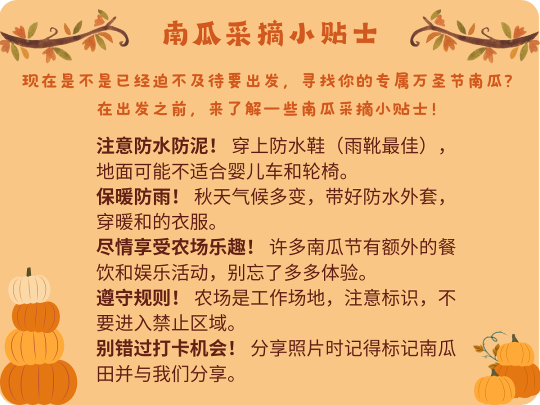 🧺同时,农场提供特别支持需求,并为5岁以下的儿童设计了“小小采摘者”活动,希望每一个小朋友都能在南瓜与自然的陪伴下,享受到独特的治愈体验。