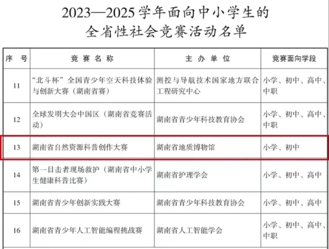 省地质博物馆充分发挥科普办职能,推动科普教育走深走实。主办的湖南省自然资源科普创作大赛,在全省中小学科学教育工作联盟成立仪式上,入选16项自然科学素养类社会竞赛活动“白名单”。