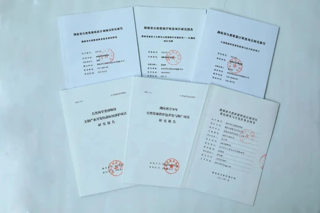近年来,省地质博物馆成功申报并实施了“湖南大熊猫化石研究”“自然资源科普展览策划与设计方法研究”“湖南省自然资源科学教育课程研究”等三⼗余项古生物、陈列展览、博物馆管理及科普教育相关研究项⽬,发表了《芙蓉国里走出的芙蓉龙》《潇湘现华彩 山水又重逢》等文章,编写并出版了“湖南古生物研究进展”系列专著、“大问地球”系列丛书等科研成果科普化书籍。