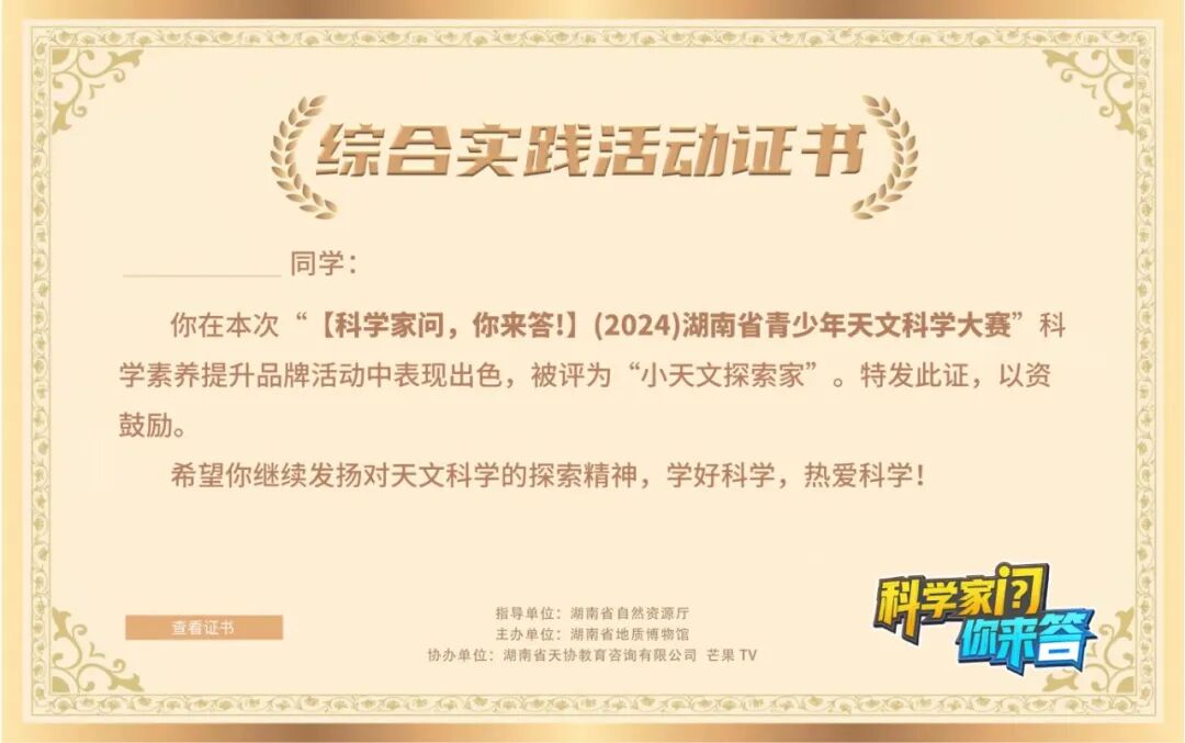 为了将科学的种子播撒在更广阔的土地上,湖南省地质博物馆联合湖南广电芒果TV、芒果大电视启动了“【科学家问,你来答!】(2024)湖南省青少年天文科学大赛”科学素养提升品牌活动,线上答题时间为6月18日至9月1日,活动期间到馆盖社会实践章需提前预约门票。