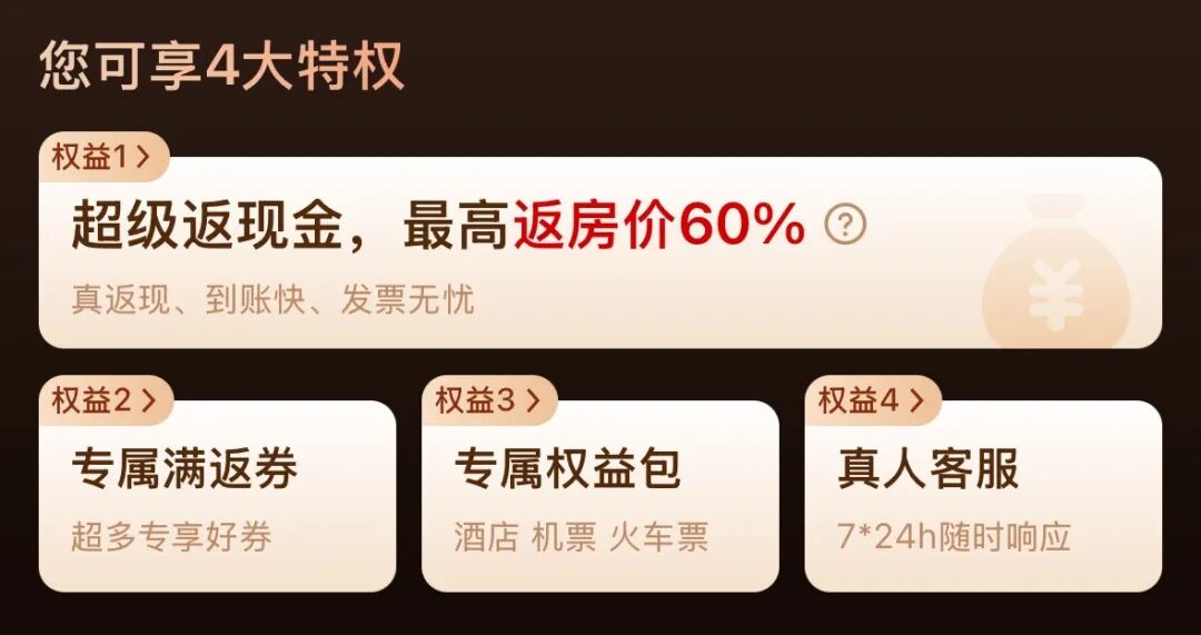 开通即得:免费酒店早餐×4、延迟退房×4房型升级×4、酒店免费取消×4并且以上权益次数可与等级会员所享权益次数叠加最高单项权益全年可享12次
