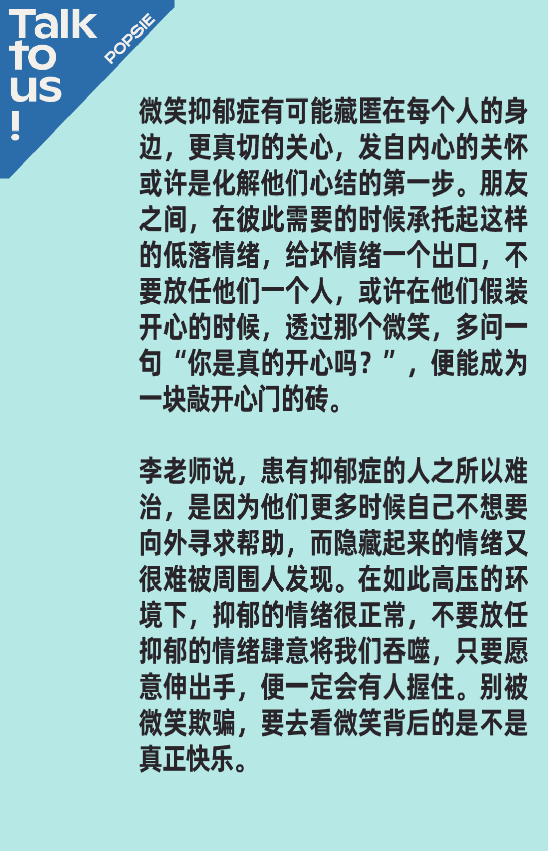 从情绪低落到抑郁,到抑郁的加重一定是一个持续的过程,需要身边的亲密朋友更加给予关注。“微笑抑郁症”就像是一个信号,一部分人在微笑过后的微表情实际上会带有一丝苦涩或者无奈,又或者会叹气,这些微笑的情感变化如果可以被身边人捕捉到对他们会更有帮助。