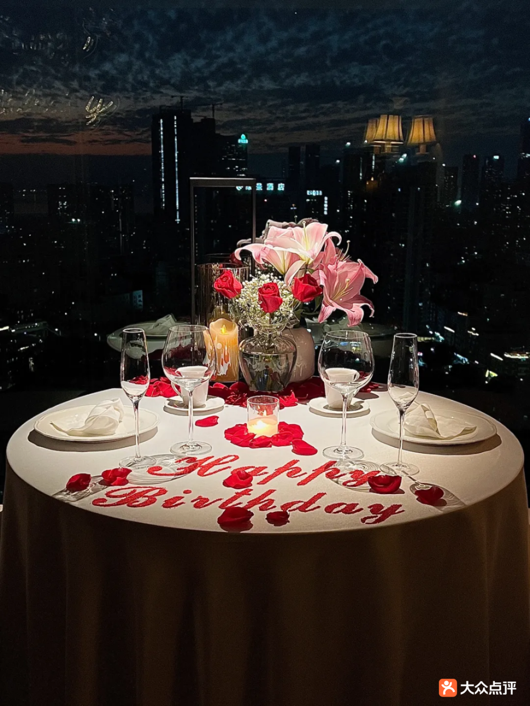 餐厅的就餐环境安静,私密性好,布景随季节和节日变化,窗外绿植与昏黄路灯营造出浪漫氛围。