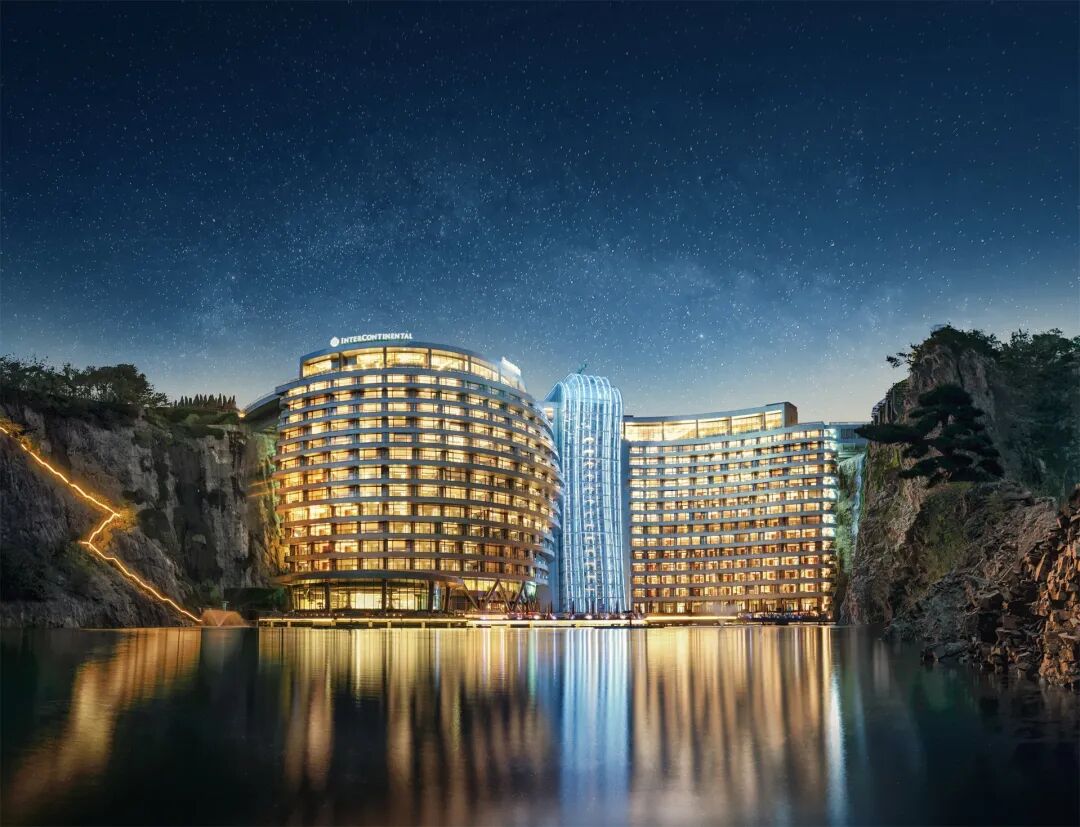 酒店由世茂集团投资建设。酒店遵循自然环境,一反向天空发展的传统建筑理念,下探地表88米开拓建筑空间,依附深坑崖壁而建,是世界首个建造在废弃的采石矿坑岩壁上的自然生态酒店,也已成为咱们国内废弃矿山生态修复的一个经典案例。