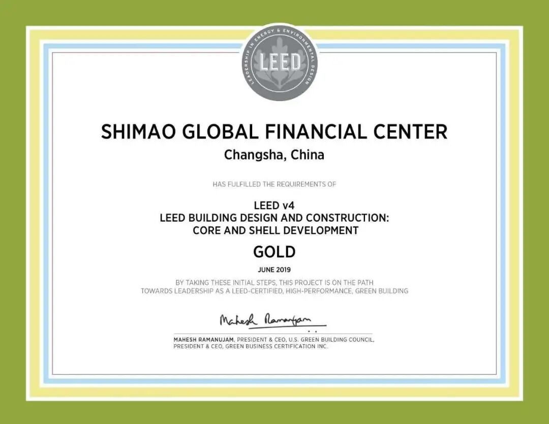 2019年6月,约343米高的世茂环球金融中心,以同步世界的建筑品质,荣膺国际LEED-CS金级认证,赢得全城业界乃至世界的目光,为长沙构建世界低碳城市和绿色建筑的目标再进一程。