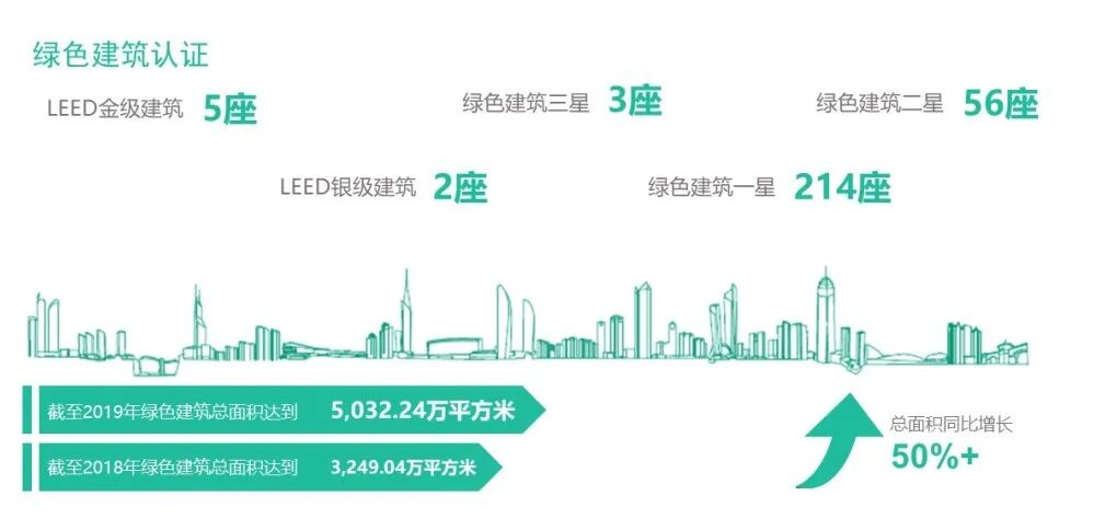 随着中国城镇化脚步的不断加快,人民生活水平不断提高,对于建筑数量和质量的要求也越来越高,这一需求也给中国建筑节能工作带来了极大的挑战,根据十三五规划,中国将建设20亿㎡以上的绿色建筑,世茂作为中国城镇化进程的深度参与者,践行企业社会责任,始终积极响应政府号召,积极探索和应用绿色建筑前沿技术,2019年绿色建筑总面积达5032.24万㎡,较2018年新增绿色建筑面积增加超50%。其中,LEED金级建筑5座,LEED银级建筑2座,绿色建筑三星3座,绿色建筑二星56座,绿色建筑一星214座。