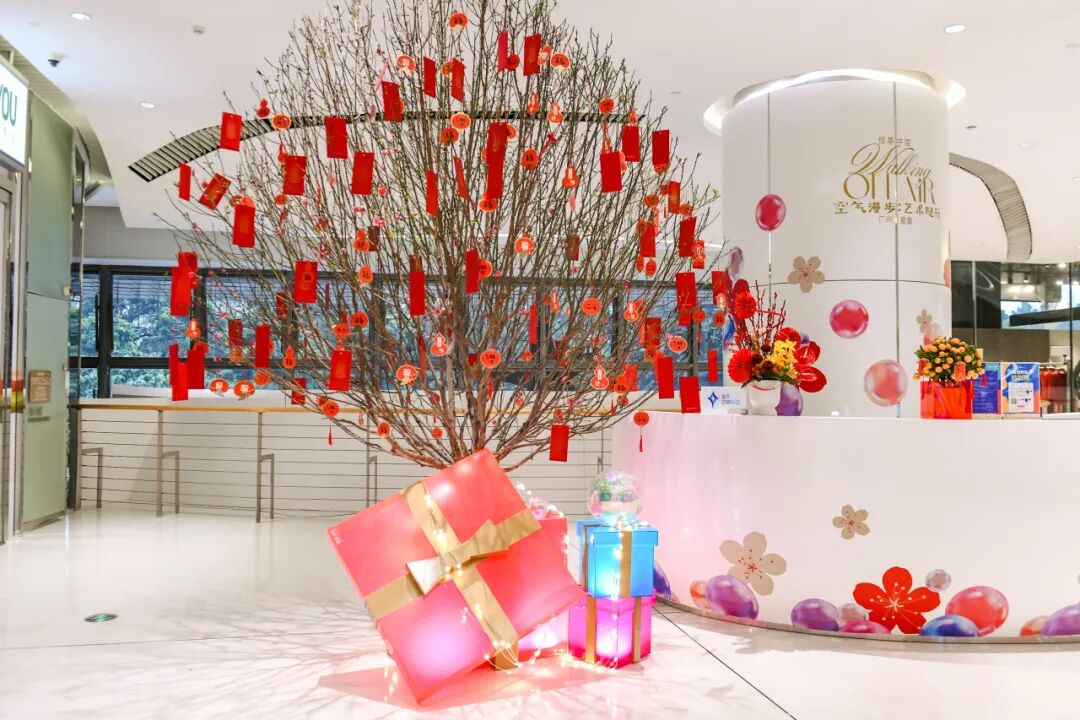 热气球、幻彩透明球和礼物盒,本次广州项目的春节装置,以寓意自由、轻盈的热气球作为主元素,搭配幻彩透明球及礼物盒,在呼应 “Walking On Air”主题的同时,也营造了喜庆的年味。