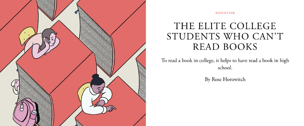今年 10 月,《大西洋月刊》(The Atlantic)发表了一篇文章,名为“无法阅读的精英大学生”,披露了一个令人困惑的现象:许多被视作精英的名牌大学生们,几乎无法在一两周内完整读完一本书。文学系的学生甚至向教授抱怨,无法“专心致志地读完一首十四行诗”。