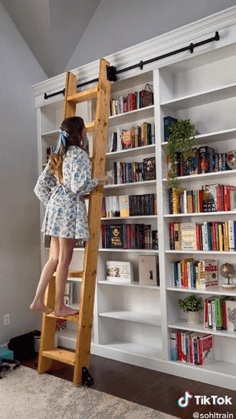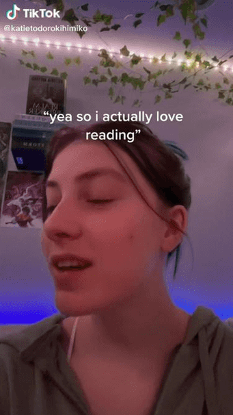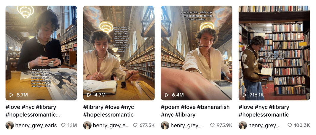 但今年更受欢迎的标签是 #LibraryTok:除了真正分享自己工作的图书馆管理员们以外,点击量更高的内容是俊男美女们走进图书馆,拍摄自己认真读书的样子——图书馆的布景和道具都是“现成”的,比在自己家里搭一个书房成本要低得多。