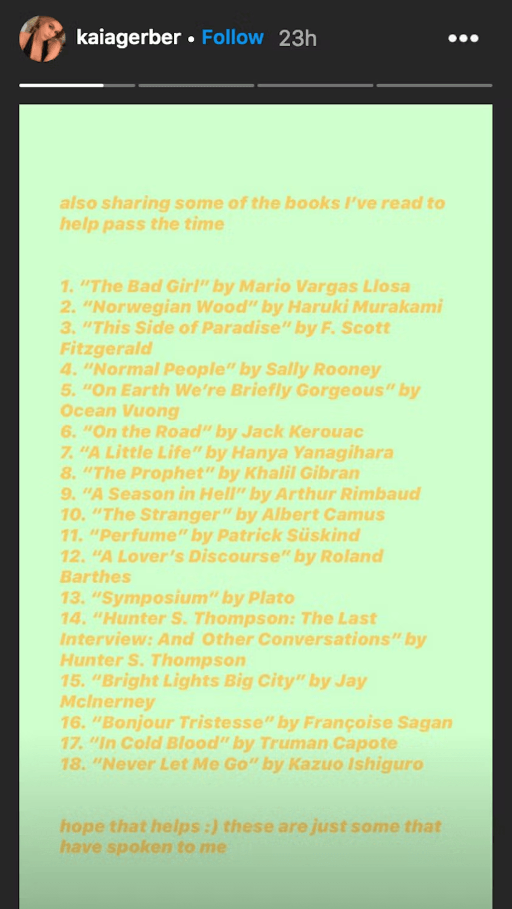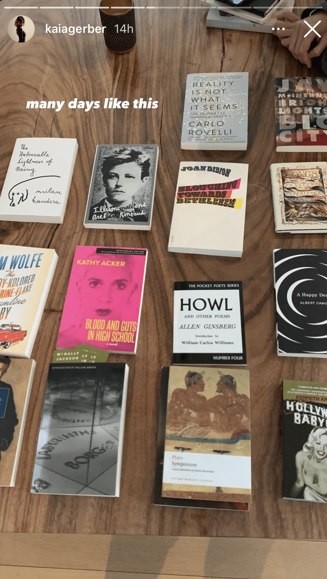 超模 Kaia Gerber 也总是书不离手,甚至将其发展成了一门事业:2020 年起,她就创办了自己的读书俱乐部 Library Science,分享自己的读书心得,还会请来年轻作家对谈。