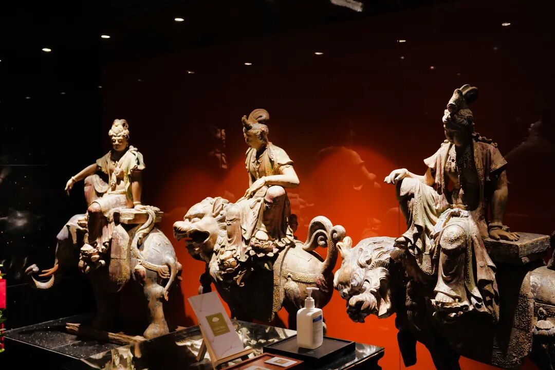 在二楼文华扒房的门口,摆放着三尊充满佛教意味的木雕像。三位菩萨姿态各异,有的坐在大象上,有的则骑在麒麟等瑞兽上,形象栩栩如生。