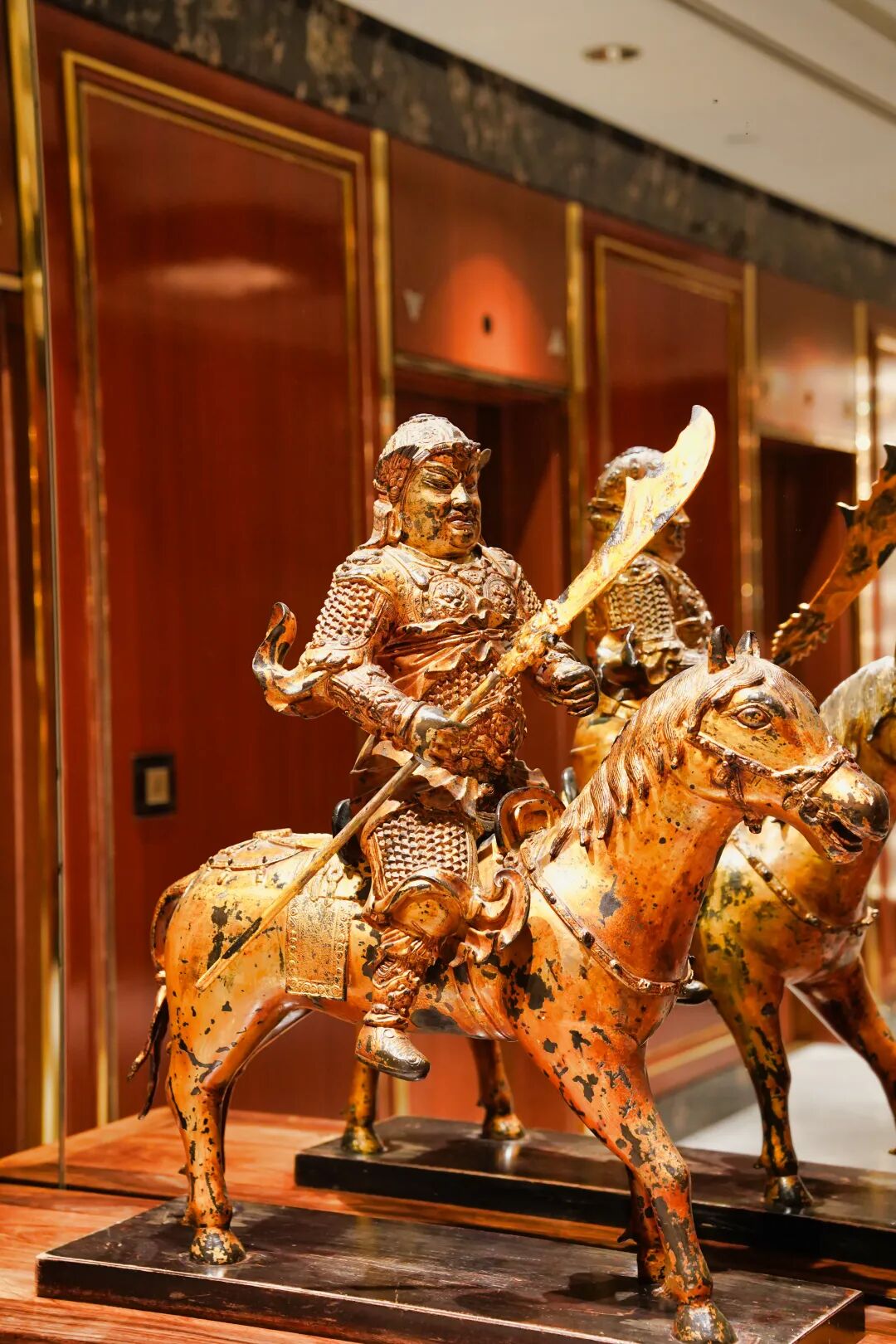 来到一楼电梯间,尽头的墙面采用了现代风格的全镜面设计,而在墙面前摆放着一尊关公手持青龙偃月刀、骑乘战马的青铜雕塑小像。