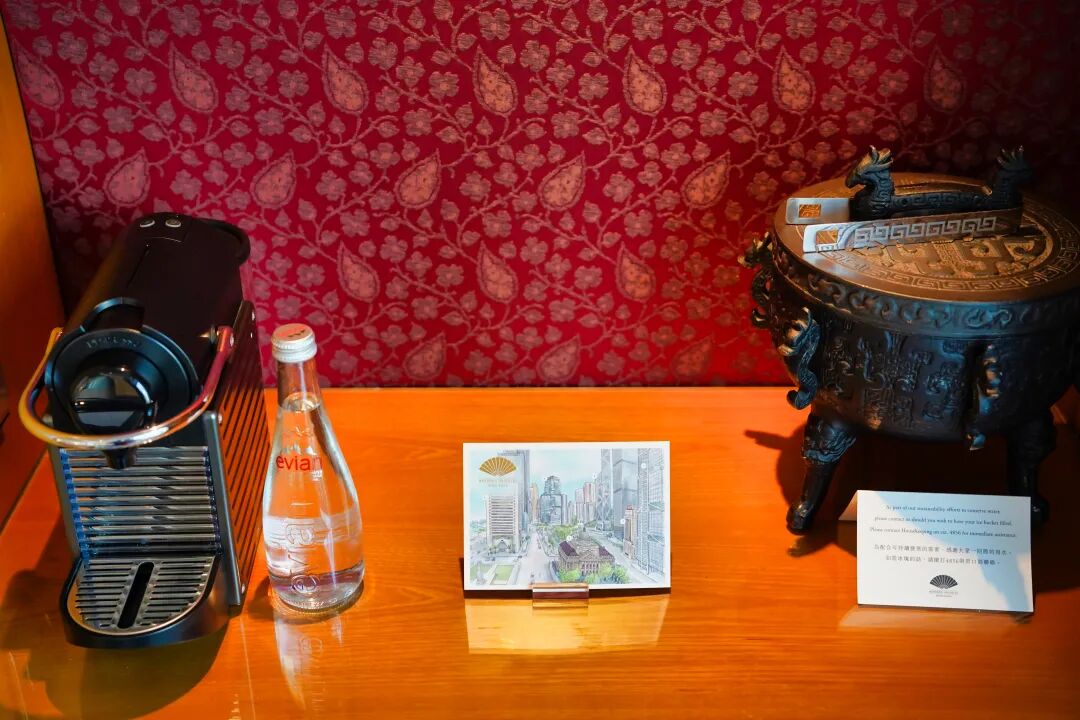 这种中西方融合的巧妙设计,甚至延续到了房间内。入住的房间里,写字桌的角落放着一个熟悉的青铜鼎,但它不仅仅是装饰品,而是可以实际使用的冰桶。