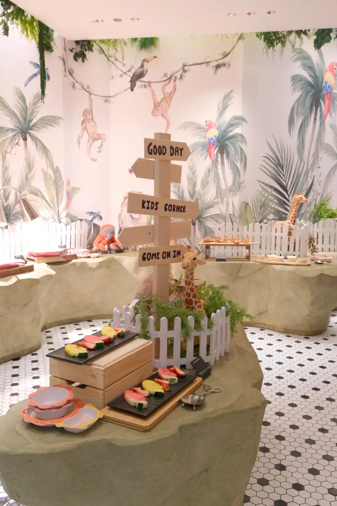 这里还专门为孩子们设置了一个儿童自助餐区,特别为小朋友打造了一个可爱又实用的美食角落。
