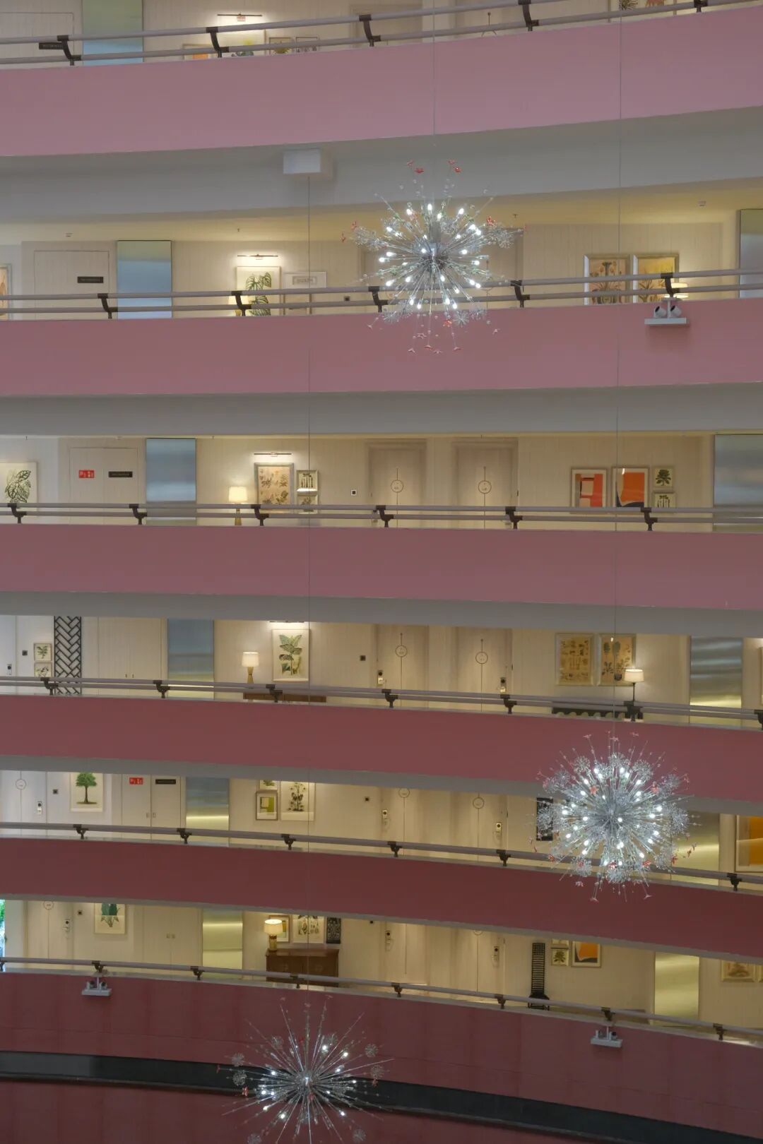 一走进酒店,便会被那座气势恢宏的中庭吸引。中庭采用三角形结构,呈扇形分布,与文华东方的扇形标志相得益彰。每一面房间的窗户都能欣赏到不同的景致,分别可以看到滨海湾景观、海景和城市风光。此外,酒店楼层的粉色设计巧妙地由高到低渐变,从浅到深,增添了空间的层次感与视觉美感。