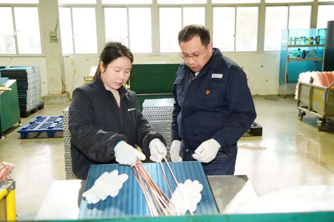一名党员就是一面旗帜,以一点红带动一片红。在中共格力电器(杭州)有限公司总支部委员会党总支书记王臣章的带领号召下,两个支部党员组建的先锋党员突击队积极奔赴两器分厂开展两器穿管任务,向目标发起冲锋。