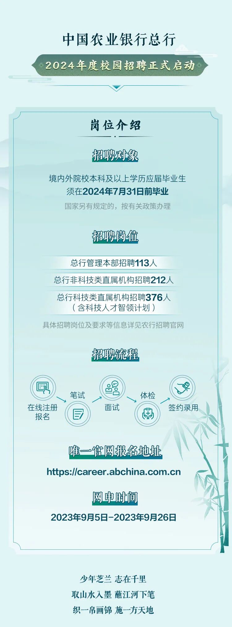 文章内容来源于公众号:中国农业银行人才招聘,点此可查看原文,内容版权归相关企业所有,本网站仅供交流学习。若涉及版权问题或存在侵权情况,请及时与我们联系,我们将第一时间进行删除处理。
