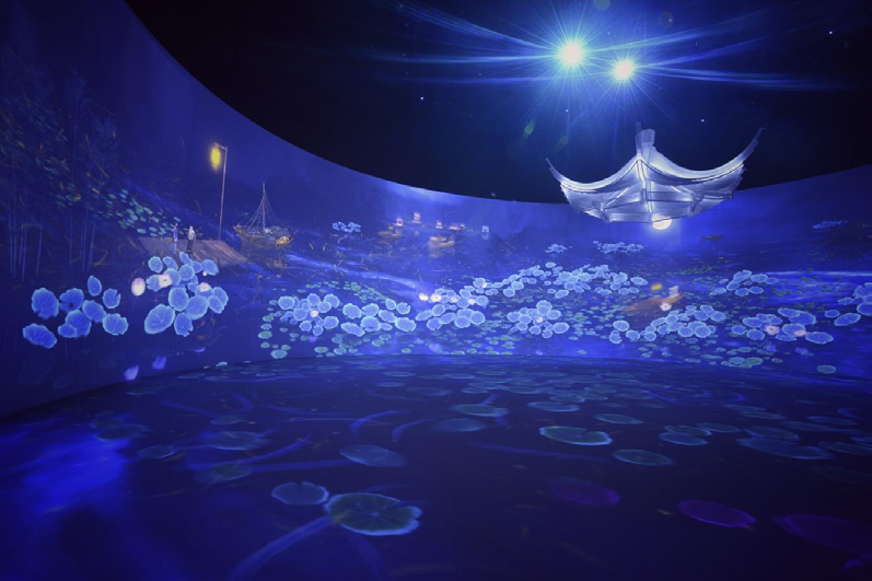中运博通过网络数字化技术保障为手段,将所要展现的背景、文化等一系列内容融于展线中,有序地开展叙事,牵引观众注意力,全身心地投入到展览所传递的内容中。展览“河之恋”以空间结构为架构,通过无隔断和造型艺术布局,充分实现空间与影片双重意义的无缝衔接。以“水”“运”“诗”“画”四个章节的象征意义,通过抽象化、符号化的多媒体语言勾勒出对“流动的文化”的唯美想象。运用“科技+艺术+文化”将写实的自然人文风光与抽象的视觉艺术相结合,突出声、光、电、形、色的感官效果,共同构成震撼的视觉画面,让观众“沉溺”于景与画构成的世界中。展览“运河上的舟楫”以时间线为基本脉络,以实体体验结合数字多媒体虚拟体验的方式,讲述大运河舟楫的演变、通过实体船模与虚拟多媒体智能交互传播,打造古代运河旁古今时光穿梭。展览空间错落有致,是现代博物馆展览与沉浸式古代场景的结合,打破参观的视线限制,充分利用空间层高特征,带来独特的参观视角,营造丰富的观展体验。