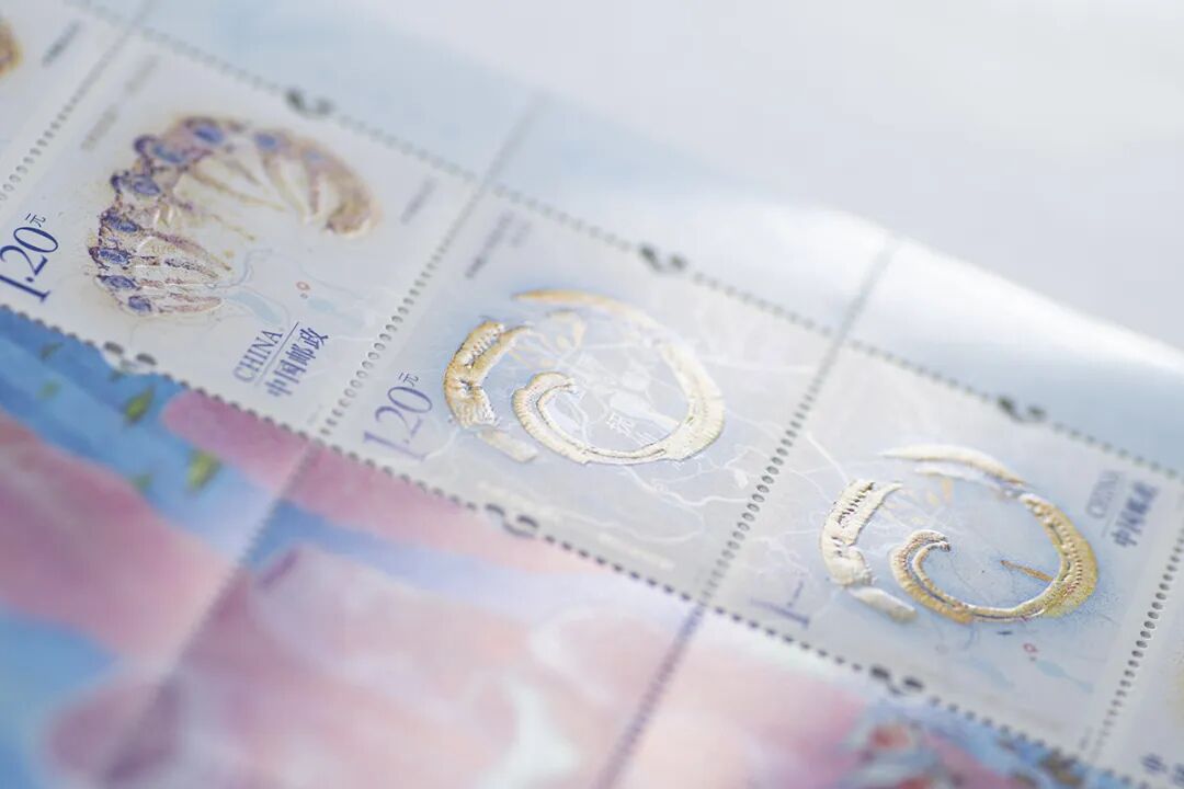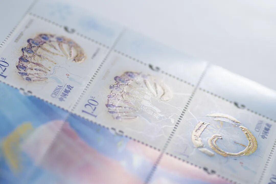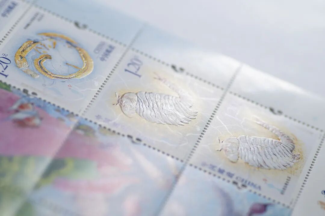该套邮票设计力求干净、纯粹,用彩铅突出手绘的感觉,在票面设计中叠加抚仙湖和帽天山区位示意图。附票不只有三枚化石对应的艺术复原图,更展现了澄江生物群海底古生物群落的整体面貌,生动再现出约5.2亿年前海洋生命的壮丽景观和生命的多样性特点。该套邮票采用高精度胶版印刷,特种珠光、金属油墨的使用更增添画面光泽效果。三维起凸工艺突出邮票主体,增加邮票立体感。紫外灯下,区位示意图呈现在邮票内。附图中37个古生物采用全真彩印刷,在紫外灯下观察,呈现色彩斑斓的发光效果,与海底古生物在高亮日光照射后反射的荧光效果相契合。邮票中还设计了缩微文字、异形齿孔等多种防伪工艺。