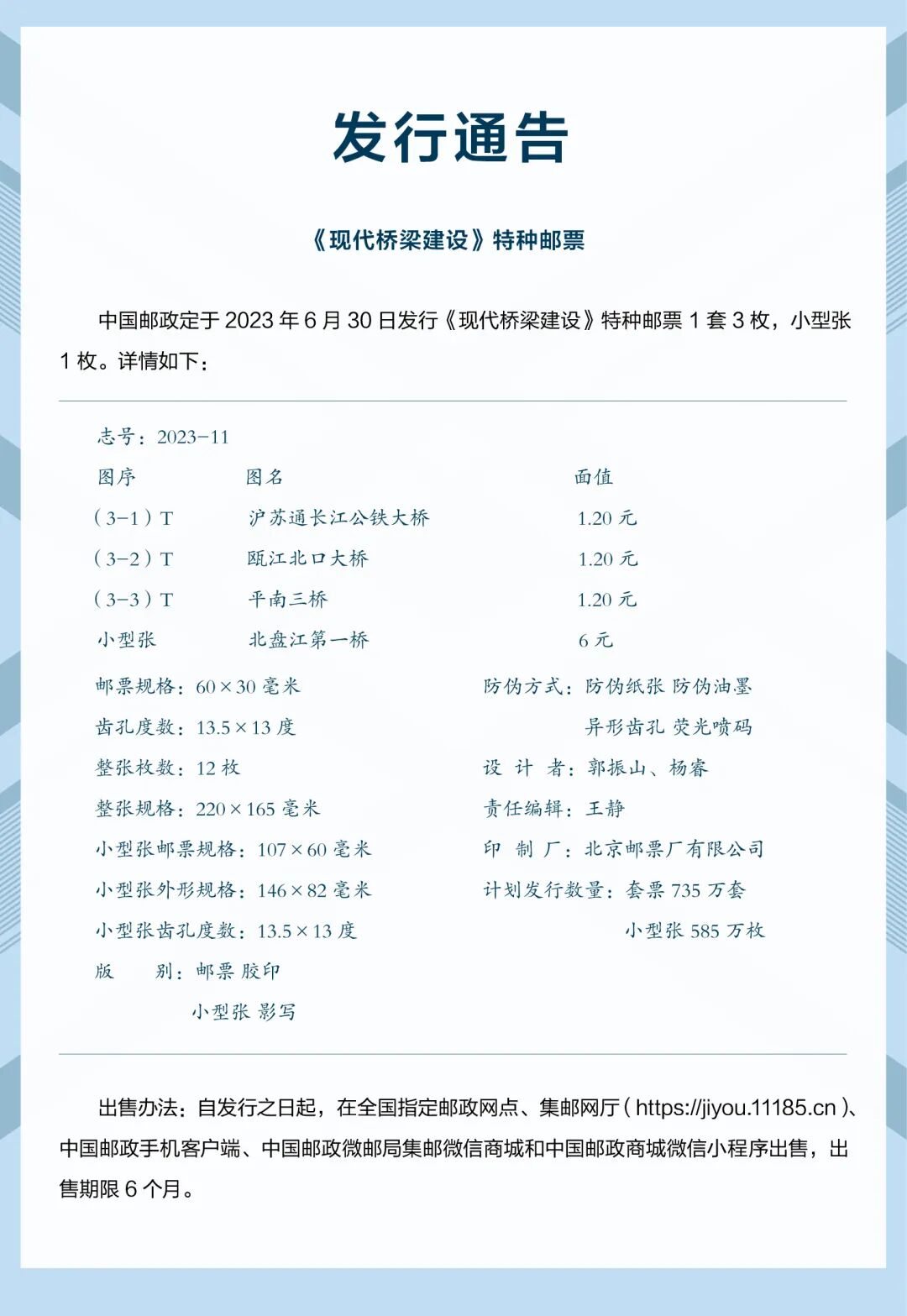 中国邮政定于2023年6月30日发行《现代桥梁建设》特种邮票1套3枚、小型张1枚,邮票图案名称为沪苏通长江公铁大桥、瓯江北口大桥、平南三桥,小型张图案名称为北盘江第一桥。全套邮票面值9.60元。邮票计划发行数量为735万套,小型张计划发行数量585万枚。