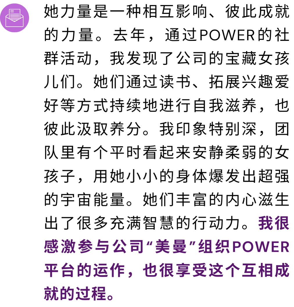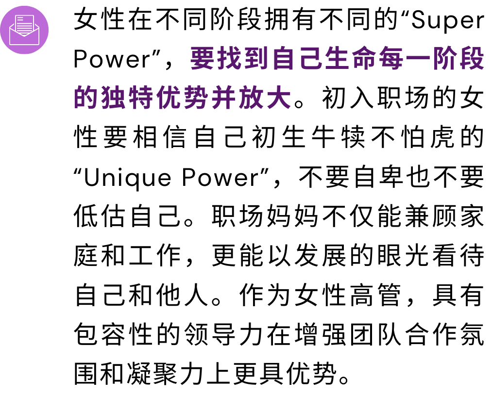 哇!三位boss的分享让我能量满满。今天近距离感受到了三位职场Shero的独特魅力,很荣幸平时身边有如此优秀职场偶像言传身教。最好的传承,不是告诉我们“你可以”,而是让我们看到“她们已经做到”。我会继续挖掘自己内在的她力量,全力以赴追求目标,保持坚韧并相信自己,为身边人带来积极影响!