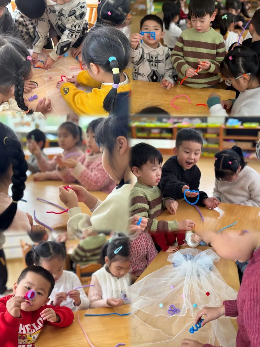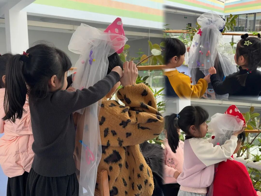 大班哥哥姐姐以小组为单位,齐心协力制作创意头纱。五颜六色的毛根在孩子们手中灵活翻转,毛茸茸的毛球被巧妙地粘贴在头纱上,化作一朵朵灵动的小花、一只只俏皮的小动物。孩子们充分发挥自己的想象力,让每一款头纱都成为独一无二的艺术品,饱含着他们对 “女神” 的美好祝福。制作完成后,孩子们迫不及待地寻找他们心中的 “女神”—— 幼儿园里的老师们。当孩子们小心翼翼地将头纱轻轻戴在老师头上时,老师们惊喜的笑容绽放在脸上。那一刻,教室里充满了欢声笑语,爱与感恩在空气中弥漫开来。老师们纷纷与孩子们拥抱,感谢这份特别的礼物。