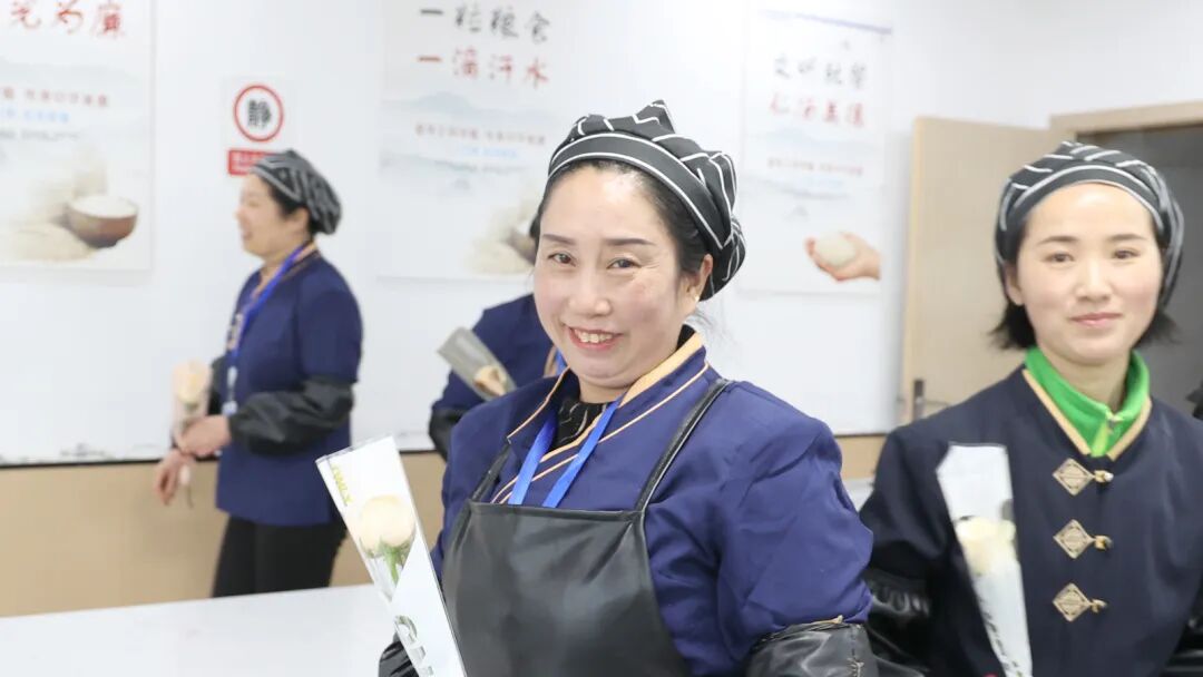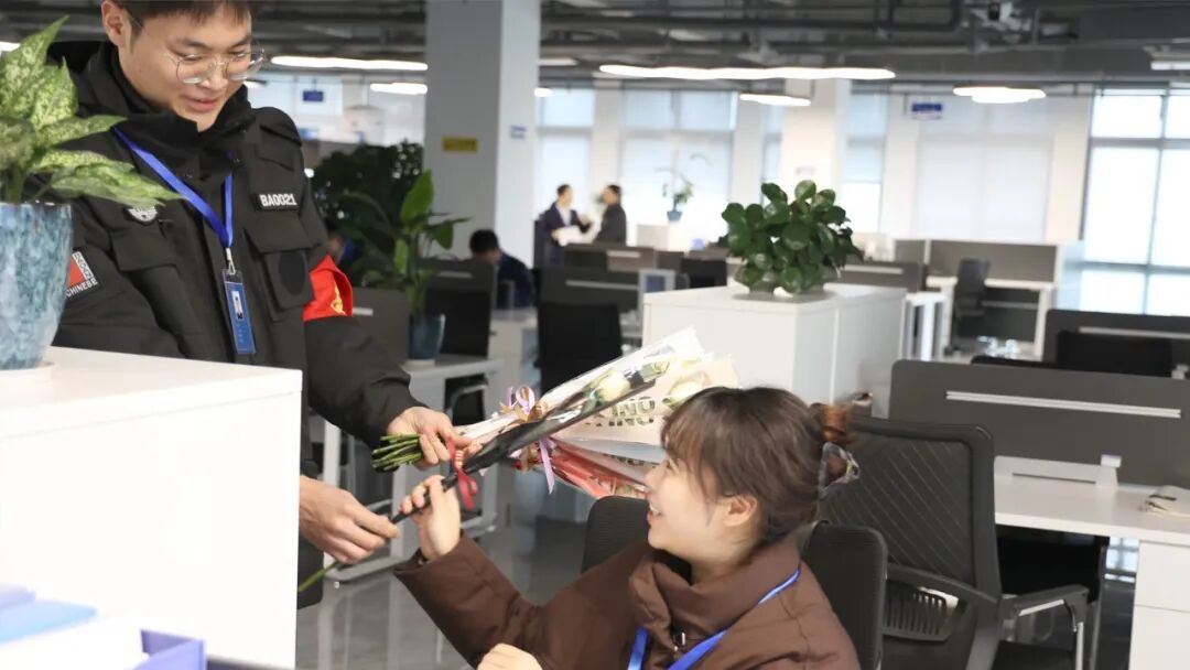 当天早上,公司保卫化身“惊喜派送官”,将精心搭配的玫瑰送至每一位女性员工手中。花瓣上的晨露未散,工位间的笑意已浓——有人将花束轻倚电脑旁,有人用花瓶细心供养,公司的一角因一抹柔色而瞬间鲜活。