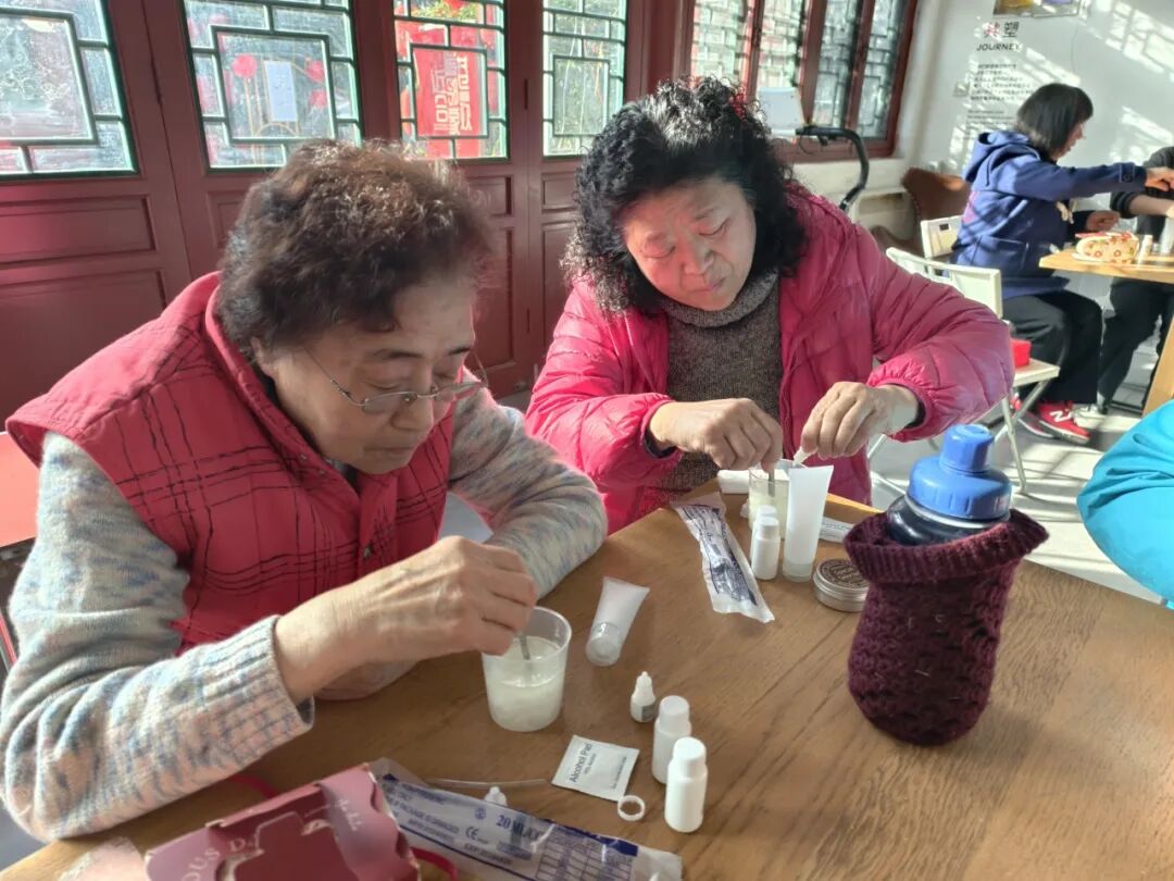 大家一边交流心得,一边互相协助,亲手制作出天然安全的护手霜。大家都迫不及待地在手上涂抹,体验亲手制作的护手霜效果。活动中大家还为在守望岗值守而不能参加此次活动的女性志愿者们也制作了护手霜,将心意传递给为社区奉献的女性志愿者们,并送上节日的祝福。