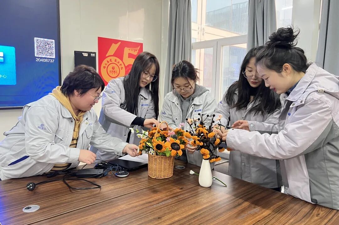 怀柔区域开展“插花识趣味,指尖绽放”扭扭棒鲜花手工制作互动。女职工分组协作,为六建集团制作2024年“开工礼”。弯折、缠绕、固定、胶装,随着一道道工序有条不紊进行,一会儿一个盛开的向日葵花篮和一个柿子压弯枝头的花瓶摆件便制作完成。大家集思广益,将作品命名为“蒸蒸日上”和“‘柿’事平安”,饱含着对企业的美好祝愿。希望新的一年里,发展“蒸蒸日上”、更上一层楼,工程进展都能顺心顺意,好事多多。