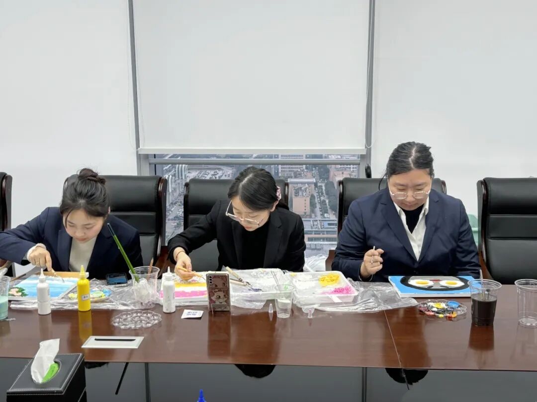 西南公司活动室内,色彩斑斓的石英砂与细腻的画料交织成梦,每一粒都承载着创意与灵感,它们或聚或散,艳丽的色泽与层次感融为一体,形成独特的肌理之美。在柔和的灯光下,女职工们专注的神情格外动人,她们以画为媒,交流着生活点滴与艺术感悟。