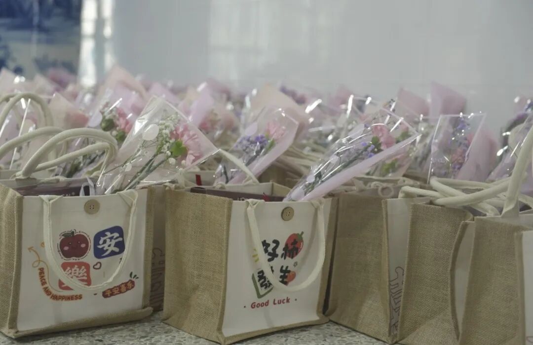 大课间时分,明德楼大厅内欢声笑语,热闹非凡。学校领导早早等候在此,为每一位女教职工送上伴手礼,并致以节日的祝福。精致的小礼品和鲜花,体现了学校对女教职工们细致入微的关怀与照顾。教师们面带幸福的微笑,在精心布置的背景板前留影纪念,捕捉这一刻的美好时光。