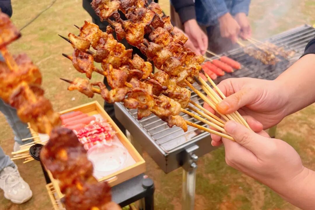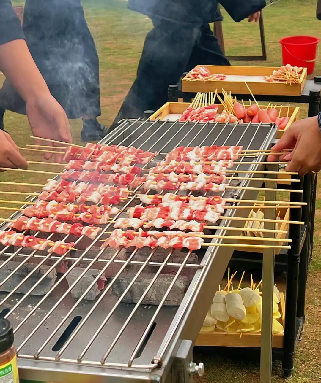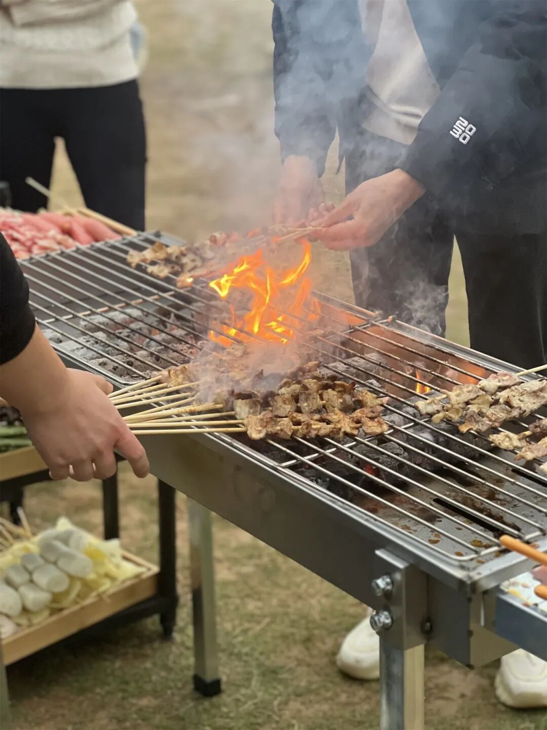袅袅炊烟升起,大家三五成群围绕在烧烤架旁,添柴点火、递食材、刷调料、烤肉、装盘……大家自己动手,提前腌制、切块、穿串好的各类食材在烟熏火烤中散发出阵阵诱人的香气。分散各处活动的职工纷纷闻香而来,争相品评美味,共享欢愉时光。