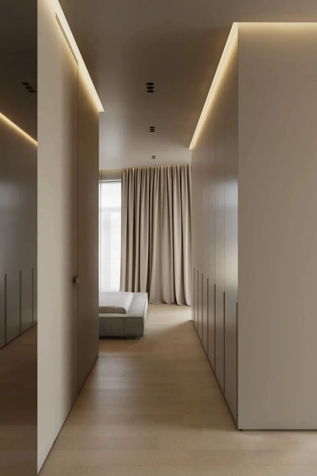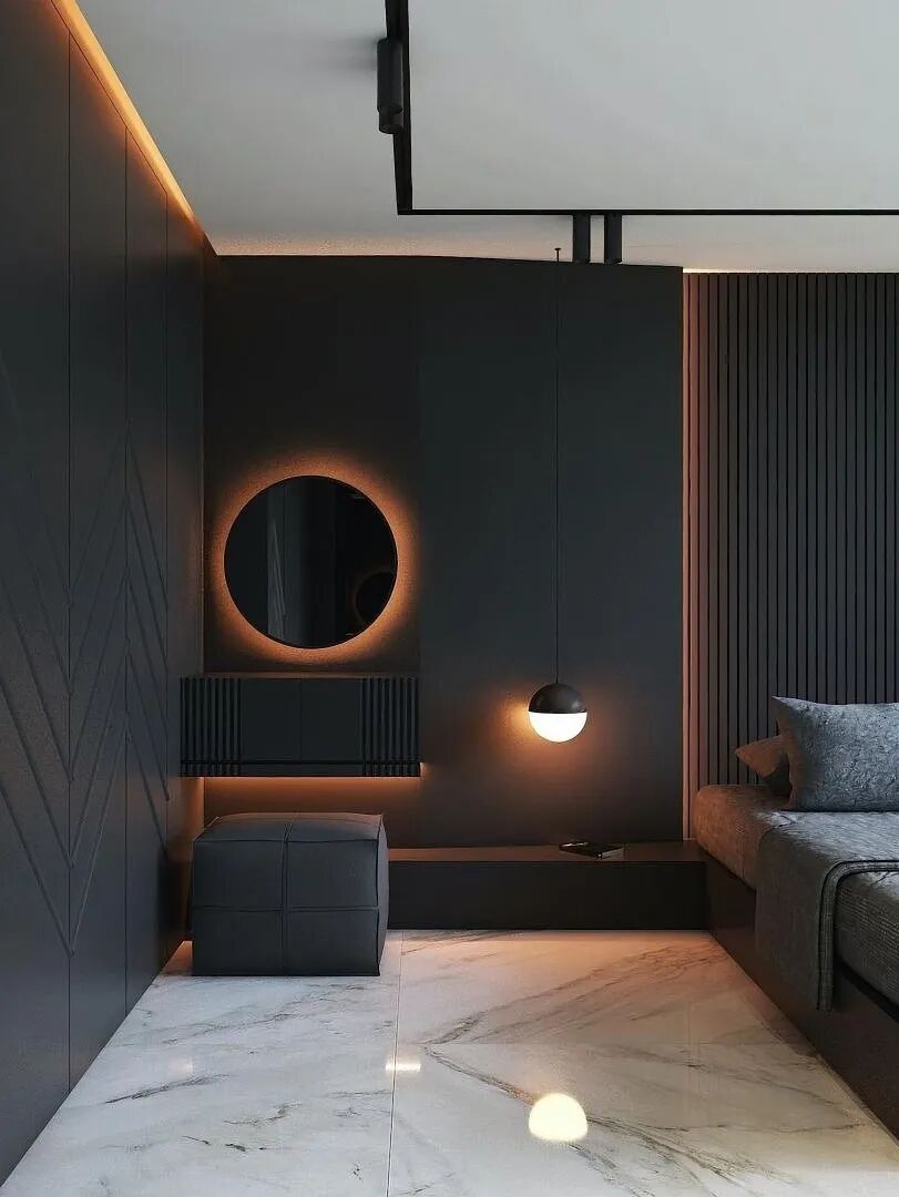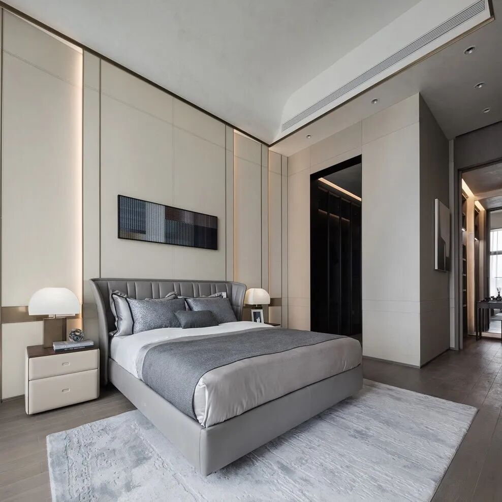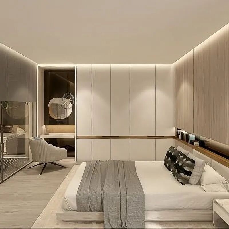 上了年纪后老人起夜次数会变多,因此在过道、走廊、楼梯等处尽可能多的安装感应地灯,让老人夜晚看得清。卧室主灯照明不宜过低,且床头上方不宜采用向下的射灯,床头可以选择可转动、拉伸的床头灯,不占用桌面空间,还能调节光线亮度,非常方便。