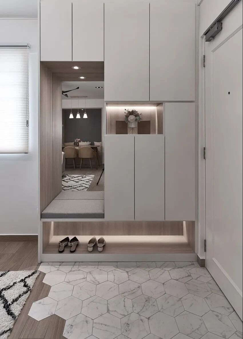 避免让老人长时间垫脚或弯腰,引发健康问题。设计玄关柜时,玄关处的鞋柜下可以留出高度约300mm的空挡,用来放置老人常穿的鞋子,避免弯腰找鞋。同时,在玄关最好要备一个换鞋凳,方便老人坐下换鞋。