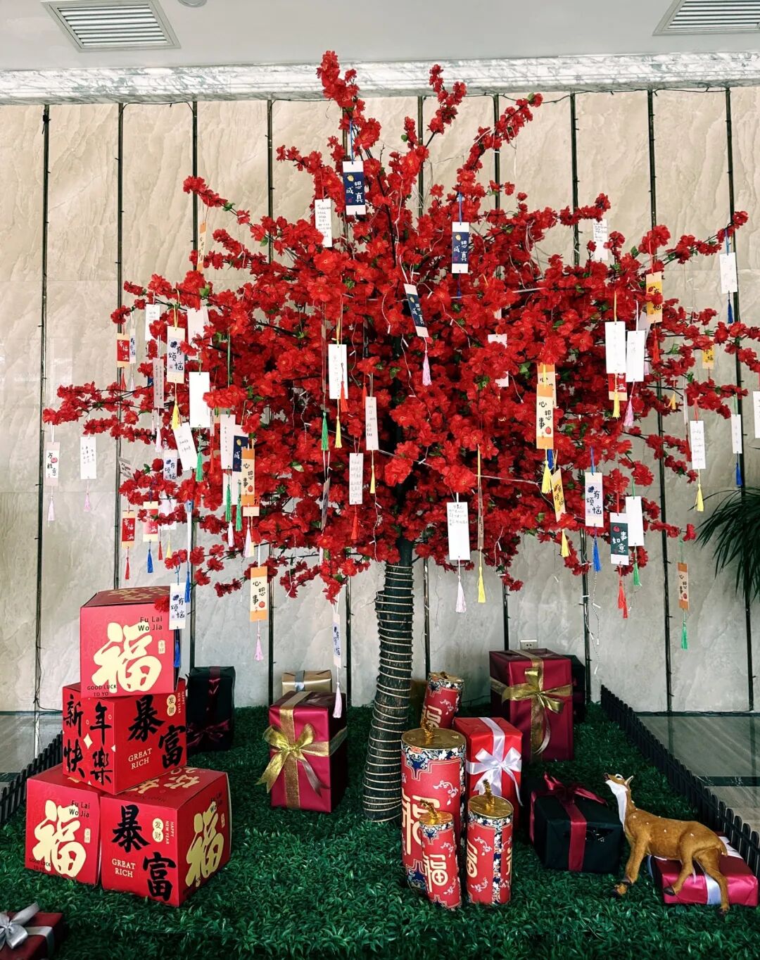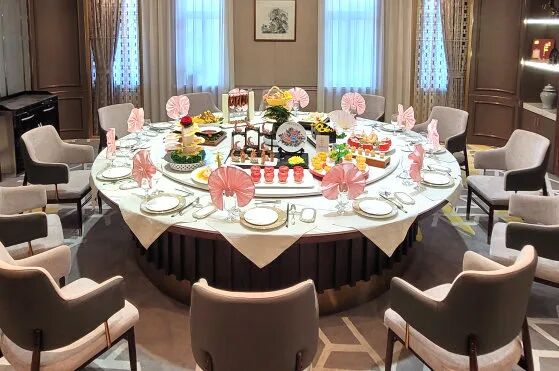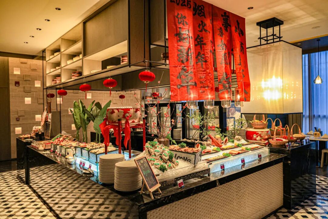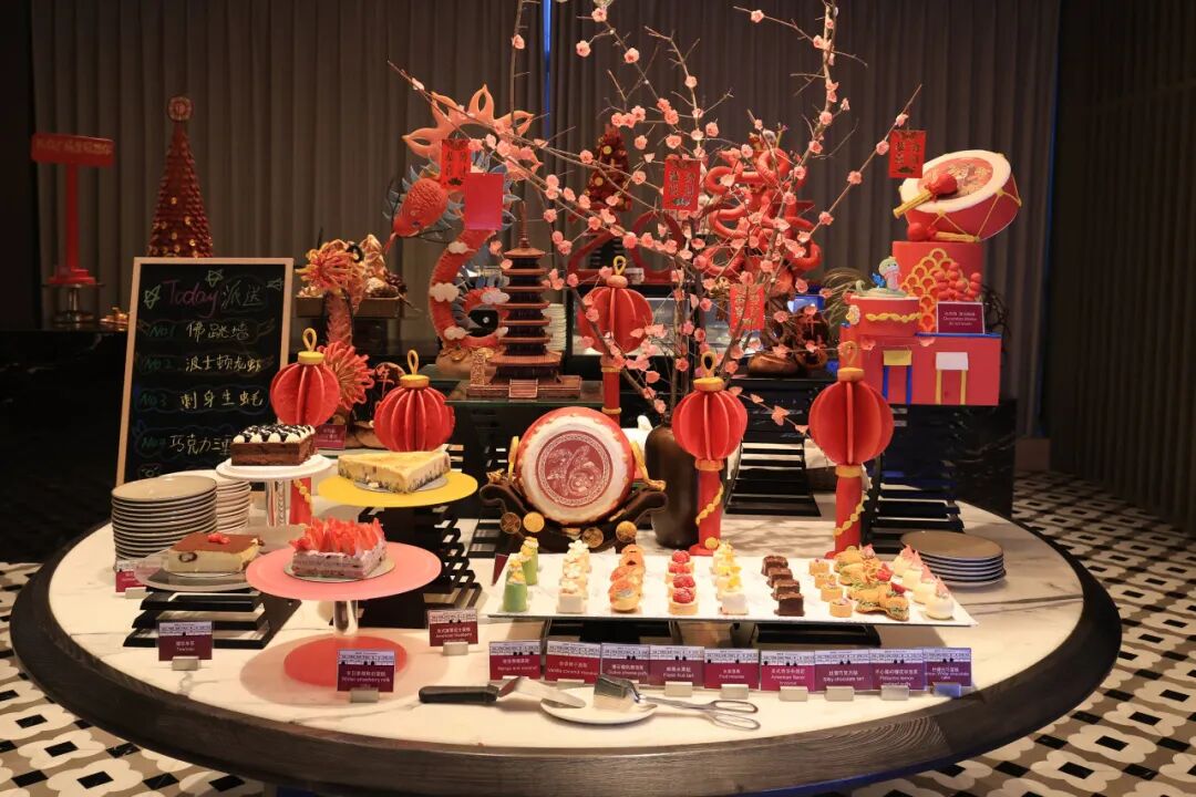 酒店设置“灵蛇祈福许愿树”、“福运转盘”,增加趣味性和互动性,营造浓厚的节日氛围。“蒸碗礼盒”,为顾客提供节日美食选择。