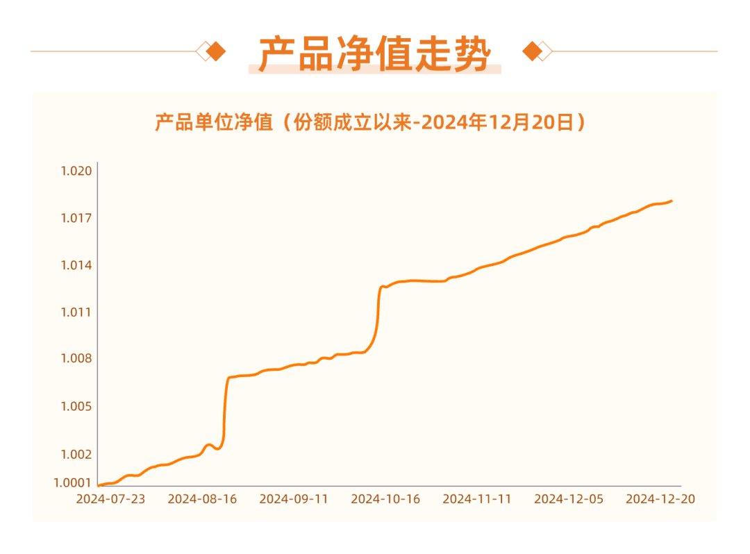 (数据来源:光大理财,本产品成立于2024.7.23,数据截至2024.12.20。业绩比较基准(年化):2.30%-2.80%,业绩比较基准根据策略目标基准中债综合财富指数等历史数据进行测算。业绩比较基准是管理人基于产品性质、投资策略、过往经验等因素对产品设定的投资目标,业绩比较基准不是预期收益率,不代表产品的未来表现和实际收益,不构成对产品收益的承诺。)